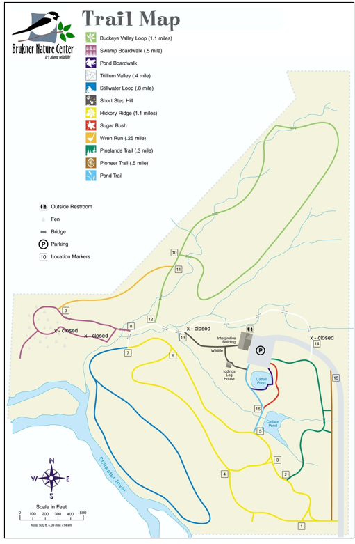 Brukner Nature Center has 6 miles of nature trails that allow you to search for wildlife through woodland, wetland, and prairie.